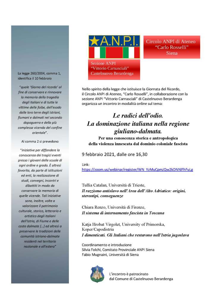 Nello spirito della legge che istituisce la Giornata del Ricordo, il Circolo ANPI di Ateneo, “Carlo Rosselli”, in collaborazione con la sezione ANPI “Vittorio Carnasciali” di Castelnuovo Berardenga organizza un incontro in modalità online sul tema:
